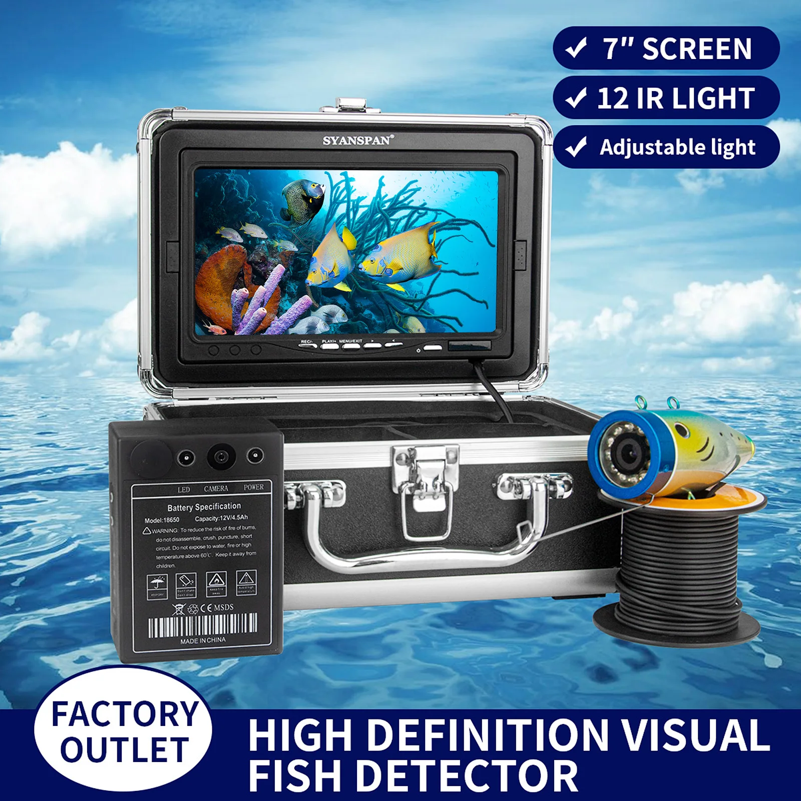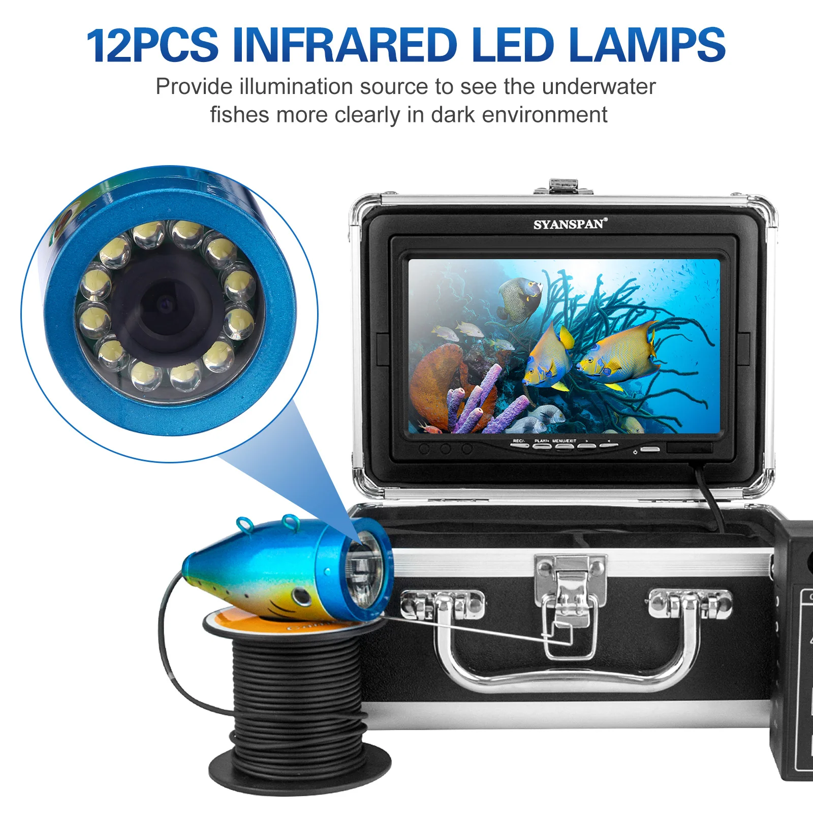 Product Name: Cámara De Pesca Submarina, Buscador De Peces De 7 Pulgadas, 1200TVL, 12V, 4500mAh, Lámparas LED Infrarrojas De 15M/30M/50M Para Pesca En El Mar Hielo